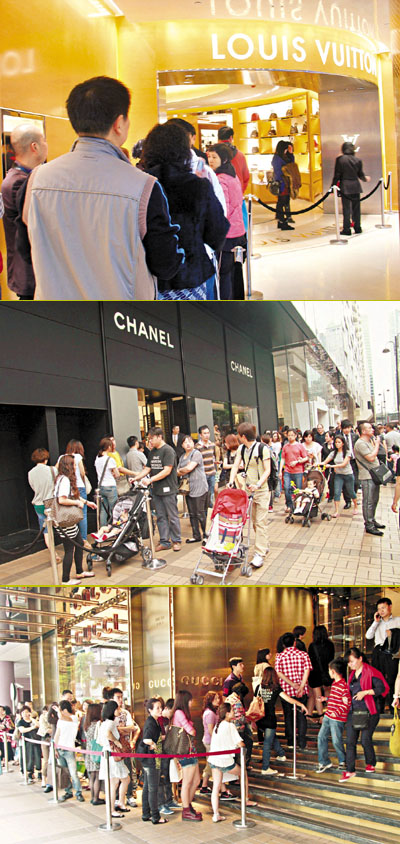 每逢内地长假,香港名店LV(上图)、CHANEL(中图)和GUCCI(下图)门前例必有人龙。资料图片