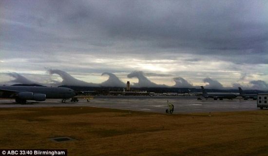 上周,美国阿拉巴马州,伯明翰附近的一家机场上空出现怪异的云浪。