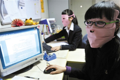 2009年2月22日,武汉鲁巷广场一公司两位工作人员戴防辐射面罩和防护眼镜防电脑辐射。资料图片 周超 摄