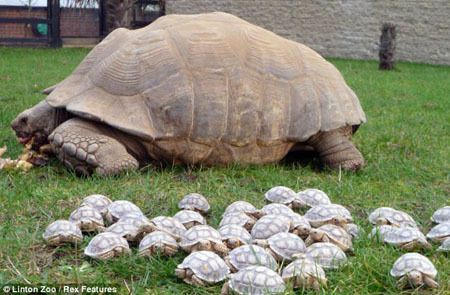 美国马塞诸塞州林顿动物园的一只苏卡达象龟要抚养45只龟仔长大。