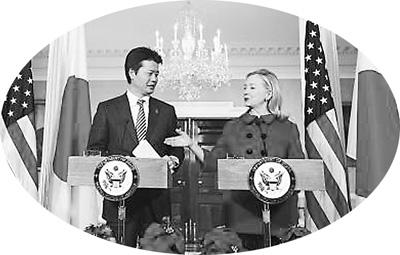 美国国务卿希拉里·克林顿(右)与日本外相玄叶光一郎会谈后会见记者。