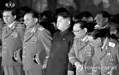 朝鲜中央电视台昨日播放朝鲜劳动党中央军事委员会副委员长金正恩率领朝鲜高层向父亲金正日致哀的电视画面,其中金正恩的姑父张成泽(左一)首次身穿大将军服亮相。