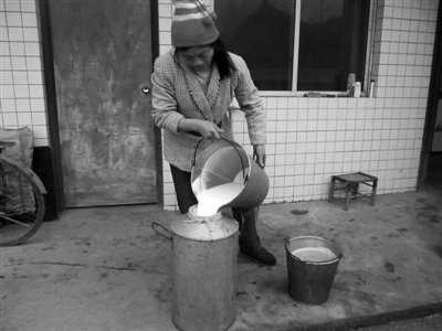 12月28日,四川洪雅县阳坪村,一名奶农将攒了两天的奶倒入奶瓶准备出售。