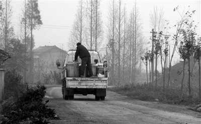 12月28日,洪雅县阳坪村,一辆运奶车刚收走一名散户的鲜奶。本报记者 孟祥超 摄