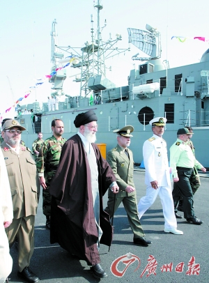 2010年2月,伊朗最高领袖哈梅内伊参加大型驱逐舰“贾马兰”号下水仪式。(图/新华)