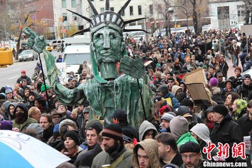 资料图:“占领华尔街”示威者当地时间2011年12月17日在纽约展开大规模抗议游行,纪念示威运动满三个月,并一度占领曼哈顿下城的杜瓦特广场Duarte Square,但这一占领行动最终并未成功,警方逮捕至少数十人。中新社记者 李洋 摄