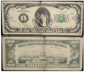 这张面额“百万美元”的假钞近日也成为美国媒体的报道焦点。据悉,这张大钞正反两面的4个角落上不但都印有1000000的数字,正面中央还印着自由女神的头部肖像,与所有真正美钞上所印的人头肖像完全不一样。