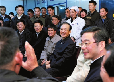 元旦晚上,温家宝来到湘潭九华杉山居民安置小区建设工地看望农民工。 新华社发