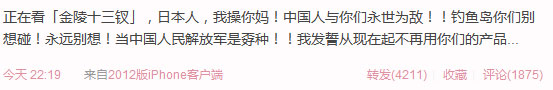 正在看《金陵十三钗》,日本人,我操你妈!中国人与你们永世为敌!!钓鱼岛你们别想碰!永远别想!当中国人民解放军是孬种!!我发誓从现在起不再用你们的产品......