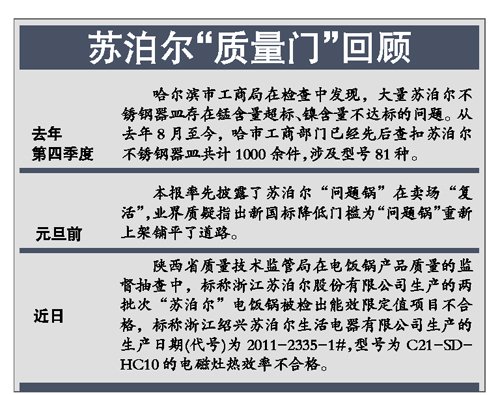 昨日,记者从陕西省质量技术监管局的官网上了解到,在该省近期对部分产品进行的产品质量监督抽查中,样品合格率分别达到85.7%和77.27%的电饭锅和电磁灶产品中,“苏泊尔”成了少数上榜“不合格”名单的品牌。而去年底,苏泊尔已爆出“问题锅”事件。