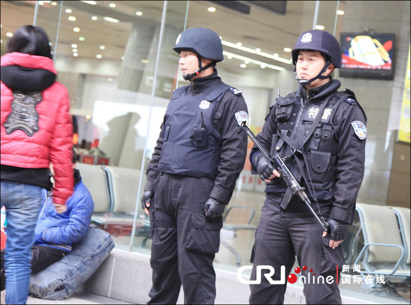 国际在线消息:2012年1月8日,江苏省南京市,1月6日在南京下关安怀村持枪杀人抢劫的犯罪嫌疑人曾开贵还在逃,特警在南京火车站等重点地段巡逻、值勤。