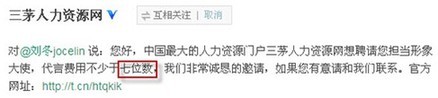 刘冬的成名速度究竟有多快?仅仅1月9日一天,她的新浪微博粉丝数便暴涨5万多,目前仍在以几乎每小时1万的速度疯狂增长中。而且,因为她的HR身份,甚至引来了业内大鳄的视线:目前,国内HR行业排名第一的三茅人力资源网已经向她发出邀请,欲聘请她为形象代言人,而且,代言费用开到了7位数的天价!