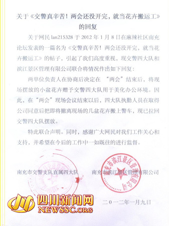1月9日,南充市交警支队直属四大队发帖回复称:“网民lan215328 所发《交警真辛苦!两会还没开完,就当花卉搬运工》帖子,实际情况为两会期间摆放于政府新区会场附近的小盆花卉为滨江景区管理有限公司管理,滨江景区管理有限公司与四大队两单位负责人协商后决定,在“两会”结束后将现场摆放的小盘花卉赠予交警四大队用于美化办公环境。因此,在“两会”现场会议结束以后,四大队执勤人员在取得滨江景区管理有限公司同意后,把即将撤离会场的几盆花卉搬上警车,现已拉回大队摆放。”
