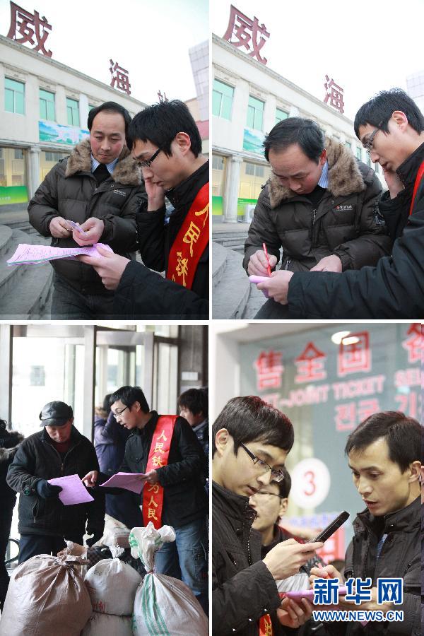 这张拼版照片显示的是张平在威海火车站帮助需要订票的人们(图左上、右上、右下为1月10日摄,图左下为1月11日摄)。