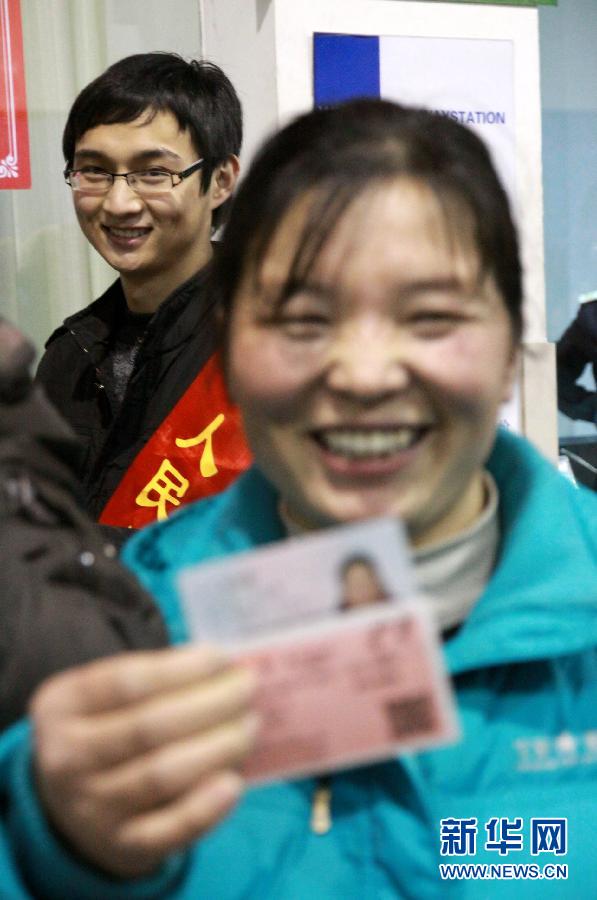 1月10日,在威海火车站售票大厅,一名农民工在张平(后)的帮助下买到火车票后开心不已,张平跟着她一起高兴。