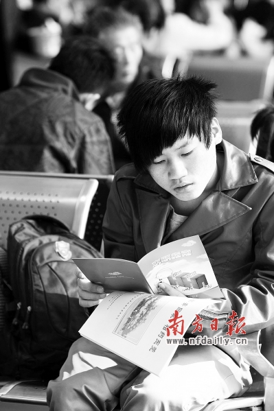 昨日,东莞市汽车客运总站,一名旅客在看《求职指南》和《平安回家,相约东莞——节后企业用工信息专刊》。 苏仕日 摄