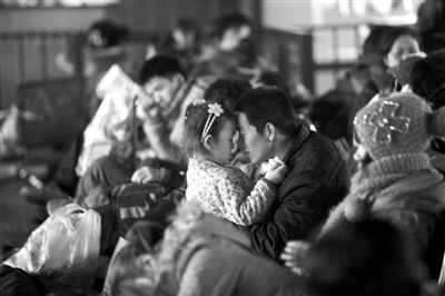 1月11日,北京西站,一对父女在候车室等待验票上车。本报记者 周岗峰 摄