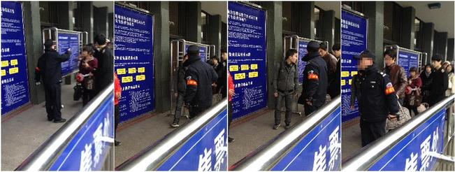 1月13日,一位身穿制服,佩戴“客票调查”字样的人将两位前往湖南的无票旅客带入了杭州火车南站,进站口的工作人员未予阻拦(拼版照片)。新华社记者 鞠焕宗 摄