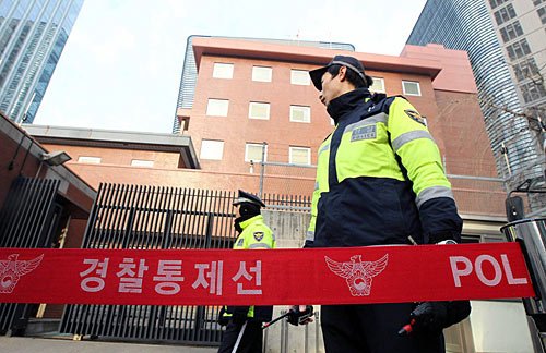 资料图:1月8日,首尔,韩国警察在事件发生后,加强了日本大使馆的警戒。