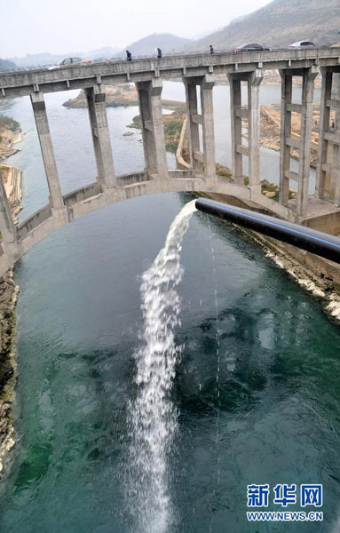 1月30日,在广西柳州市柳城县凤山镇糯米滩水电站,一股碱性流水注入下游龙江河稀释中和遭遇污染的河水。
