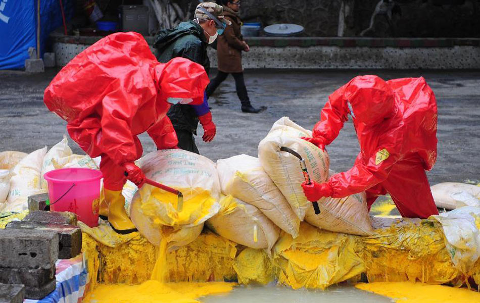 1月30日,在广西柳州市柳城县糯米滩水电站,消防队员在向处理池投放氯化铝,准备引人江中稀释污染水体