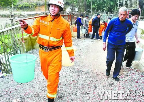 柳北区长塘镇西流村浪江屯已暂停从柳江取水,消防队员帮村民挑水