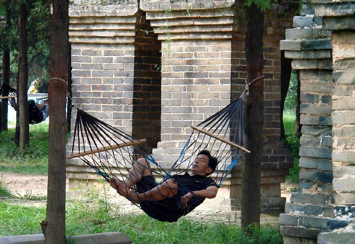 在少林寺塔林景区内,一名工作人员躺在一张吊床上酣睡(2010年8月6日摄)。新华社记者王颂摄