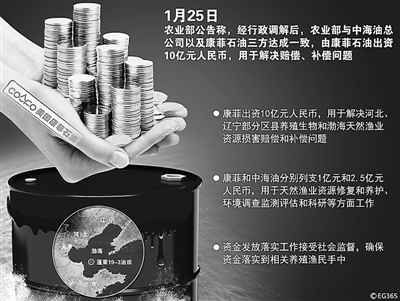 1月25日,农业部、康菲、中海油总公司分别公告称:康菲出资10亿元,用于解决河北、辽宁省部分区县养殖生物和渤海天然渔业资源损害赔偿和补偿问题。