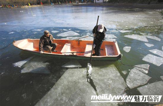 工作人员乘船破冰为鱼增氧。本报记者 王贵彬 摄
