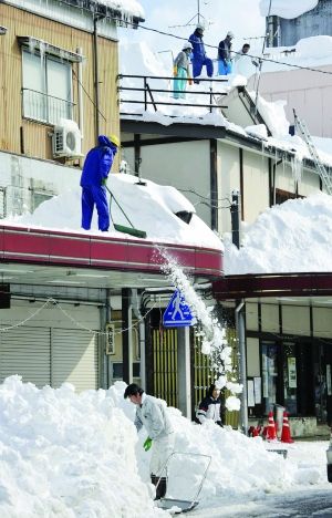2月2日,日本新潟县十日町,居民在清扫屋顶上的积雪。受冷空气影响,日本许多地区普降大雪 新华社/法新