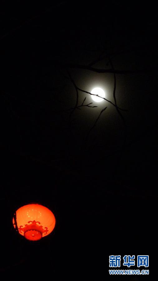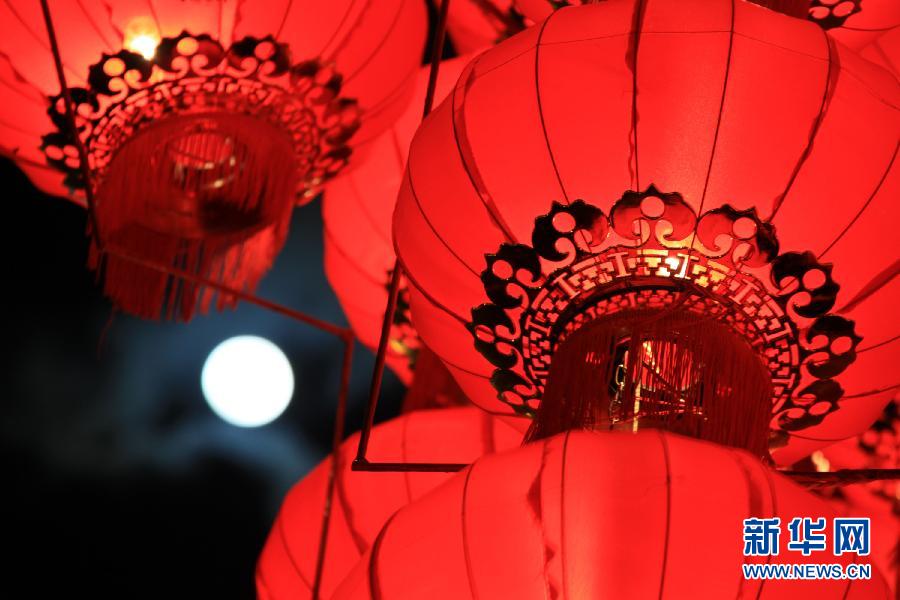 2月6日晚在黑龙江黑河拍摄的圆月和红灯笼。当日是农历正月十五元宵节,五彩缤纷的节庆彩灯与天上的圆月相映成趣,构成一幅幅美丽的画面。