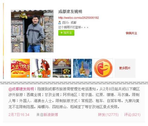 2月7日16时左右,一位名叫“成都建发姚明”的网友在微薄上称,刚刚接到成都市旅游局管理处的电话,通知从2月8日起关闭西藏全境;四川甘孜全境以及阿坝若尔盖、红原、壤塘、马尔康等地的涉外旅游,这条微博中称,外国人以及港澳台人士受限不得参加旅行团以及自驾车到这些地区旅游。