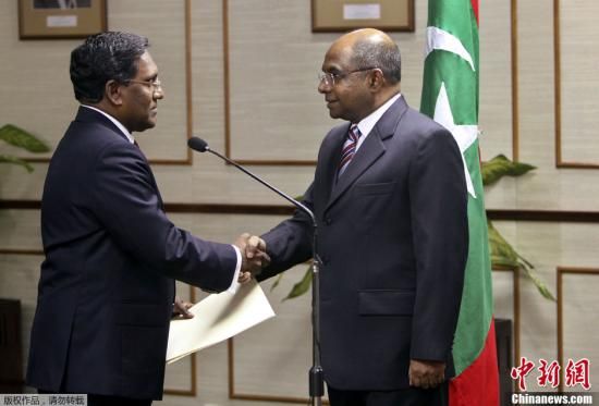 当地时间2月7日下午,马尔代夫副总统瓦希德·哈桑(Mohammed Waheed Hassan)宣誓就任总统后,与议会发言人阿卜杜拉·沙希德(Abdulla Shahid)握手。
