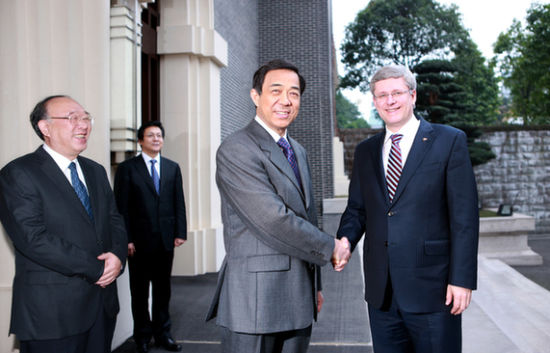 薄熙来说,重庆和加拿大有着良好的关系,政界、企业界、文化界交流广泛。贵国前总理克雷蒂安先生、加中贸易理事会名誉主席德马雷先生等,都曾多次来渝访问。重庆虽地处中国内陆,但对外合作十分活跃。长江“黄金水道”的年货物吞吐量已经超过一亿吨,加之渝新欧铁路全线贯通,机场第三跑道即将开工,重庆已由对外开放的“三线”变成“一线”。我们既“引进来”,年利用外资由2007年的十亿美元,上升到去年的百亿美元;又“走出去”,在巴西买地种大豆,在澳大利亚、非洲开矿,连续两年对外投资50亿美元,位居全国第一。加拿大幅员辽阔,资源丰富,市场体系完备;重庆是中国西部重要的消费城市,奇帆市长又是一位经验丰富、勤奋务实的经济专家。相信总理阁下此次来访,可以成为一个双方合作的里程碑,不仅带回可爱的大熊猫“二顺”,加深友谊,还将进一步拓宽合作领域,相互投资,共谋发展。