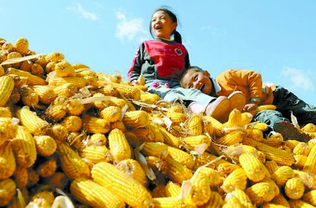 两个孩子在绥化市东富乡东升村的玉米堆上玩耍。 资料图片