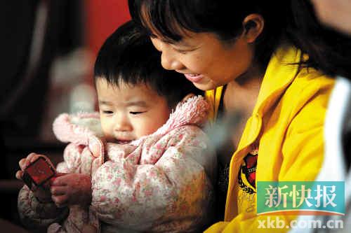 2月14日上午,曾受家庭暴力伤害的小艺艺出院,她正在妈妈的怀里,玩着玩具。记者 孟祝斌/摄