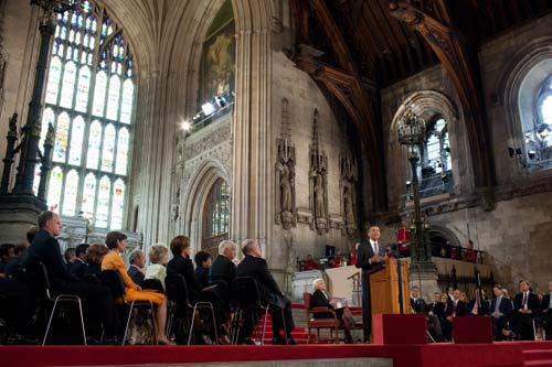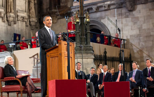 奥巴马是历史上第一个对英国上下议员同时发表演讲的美国总统。走出“野兽号”防弹座驾,奥巴马受到了议会长的出门迎接,卫兵手持长枪夹道欢迎,英国朝野各党的重要人物悉数到场,静候聆听,这个注定将记入英美外交史册的重要演讲。