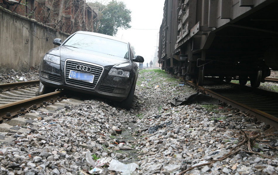 25岁的小伙夏某23日晚酒后驾车竟开上了武汉一处铁路,而且一走就是上百米,直到轮胎被磨破、车底盘被铁轨卡住才停下。他的莽撞逼停了两趟火车,使铁路方面紧急停用了这段铁路。图为2月24日,武汉,奥迪车被卡在铁轨上动弹不得。杨涛/CFP