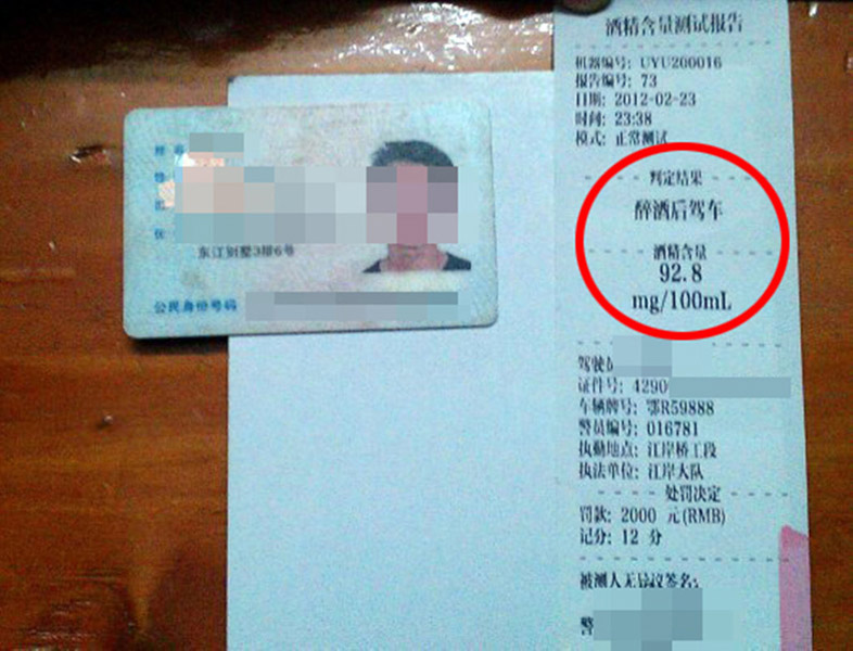 23日晚23点,江岸交警对夏某进行了吹气酒测,他吹出的气体酒精含量为92.8mg/ml,属于酒后驾驶。吹气检测完成后,夏某被移交给了武铁警方处理。江岸交警透露,这是因为事故最终影响的是铁路,其性质已经超过了普通交通事故范畴,最终处罚结果应由武铁警方作出。图为2月24日,武汉,夏某吹出的气体酒精含量为92.8mg/ml。