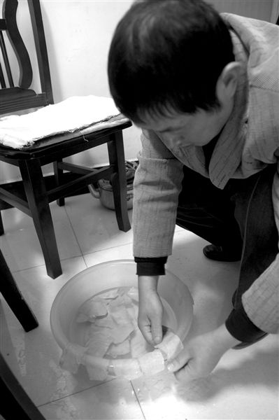 昨天,在周岩家中,周爸爸言语很少,一直在清洗周岩换下的疤痕贴。这种疤痕贴每张约200元,周爸爸每天要清洗近百张。