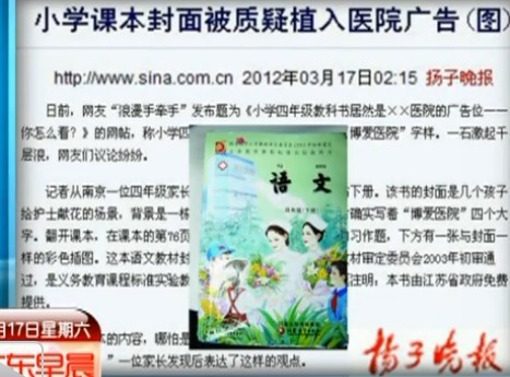 日前,网友“浪漫手牵手”发布题为《小学四年级教科书居然是××医院的广告位你怎么看?》的网帖,称小学四年级的语文课本封面上印着“博爱医院”字样。一石激起千层浪,网友们议论纷纷。