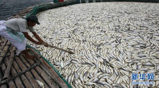 这张2011年5月29日拍摄的照片显示的是菲律宾吕宋岛西南端八打雁省的塔阿尔火山湖中打捞上来的死鱼。菲律宾政府29日说,塔阿尔火山近期显现喷发迹象,火山口周围的塔阿尔火山湖水温骤然升高,致使700多吨鱼类死亡。菲律宾渔业和水生资源部说,自27日以来,已发现752吨死亡的遮目鱼和罗非鱼漂浮在塔阿尔火山湖湖面。新华社/路透