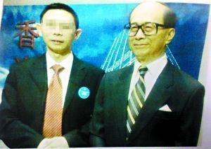 犯罪嫌疑人与“李嘉诚”(实为蜡像)的合影。图片为记者翻拍