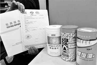 检测显示“绿A”“汤臣倍健”“清华紫光(金奥力)”等螺旋藻样品铅含量严重超标。新华社发