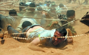 5月29日,班加西,利比亚反对派进行新兵训练,小伙子们在奋力匍匐前进。