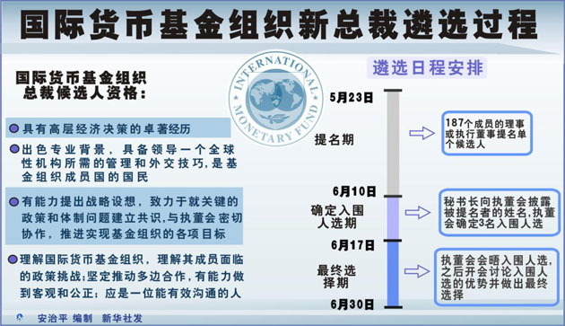 国际货币基金组织前总裁法国人多米尼克·斯特劳斯—卡恩因涉嫌性侵犯辞职。这一机构随后启动遴选新总裁程序,允许理事或执行董事5月23日至6月10日提名候选人。遴选结果预计6月30日前揭晓。