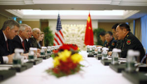 2011年6月3日,新加坡:在香格里拉酒店举行的安全峰会上,美国国防部长罗伯特·盖茨(左二)与中国国防部长梁光烈(右)进行会谈。