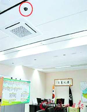 在城南市市长李在明的办公室,天花板上装有摄像头。(红圈处)