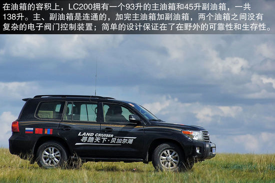 在油箱的容积上,LC200拥有一个93升的主油箱和45升副油箱,一共138升。主、副油箱是连通的,加完主油箱加副油箱,两个油箱之间没有复杂的电子阀门控制装置;简单的设计保证在了在野外的可靠性和生存性。