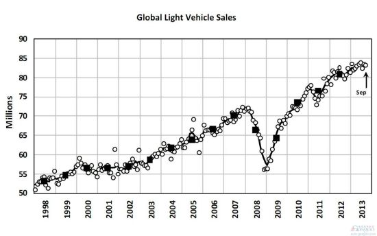 基于9月份销售速率,LMC推测2013年全年总销量为83,231,158辆。根据前三季度整体表现,推测全年销量为83,104,499辆。2012年9月销售速率年化值SAAR为81,163,449辆,今年将同比增长2.4%。
